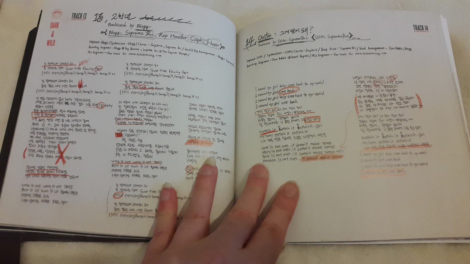 Dark & Wild is the first album I've had that has been packaged the way it is, it's all presented in a box that has a little ribbon that lifts out the booklet to reveal the CD underneath. The box is black with the BTS logo in red and the Dark & Wild in big white stand out letters, there's even a little warning on the album saying: Warning! Love hurts, it causes anger, jealousy, obsession, why don't u love me back? The booklet is full of group and individual shots along with the lyrics and album credits all following the black, white and red colour theme.