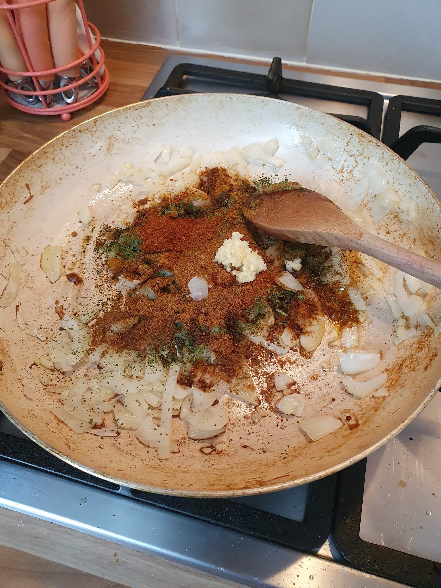 Heat the oil in a large frying pan and add the diced onion and cook for 2-3 minutes until softened.